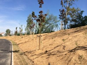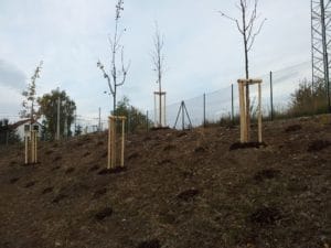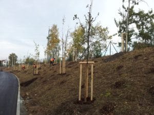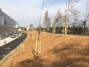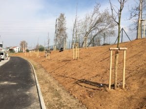 Parkové úpravy, výsadba alejových stromů a živé ploty v rámci stavby nové výrobní haly v Českých Budějovicích.