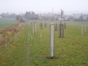 Výsadba stromů na rozsáhlém pozemku na okraji obce, vegetační odclonění od okolních pozemků.